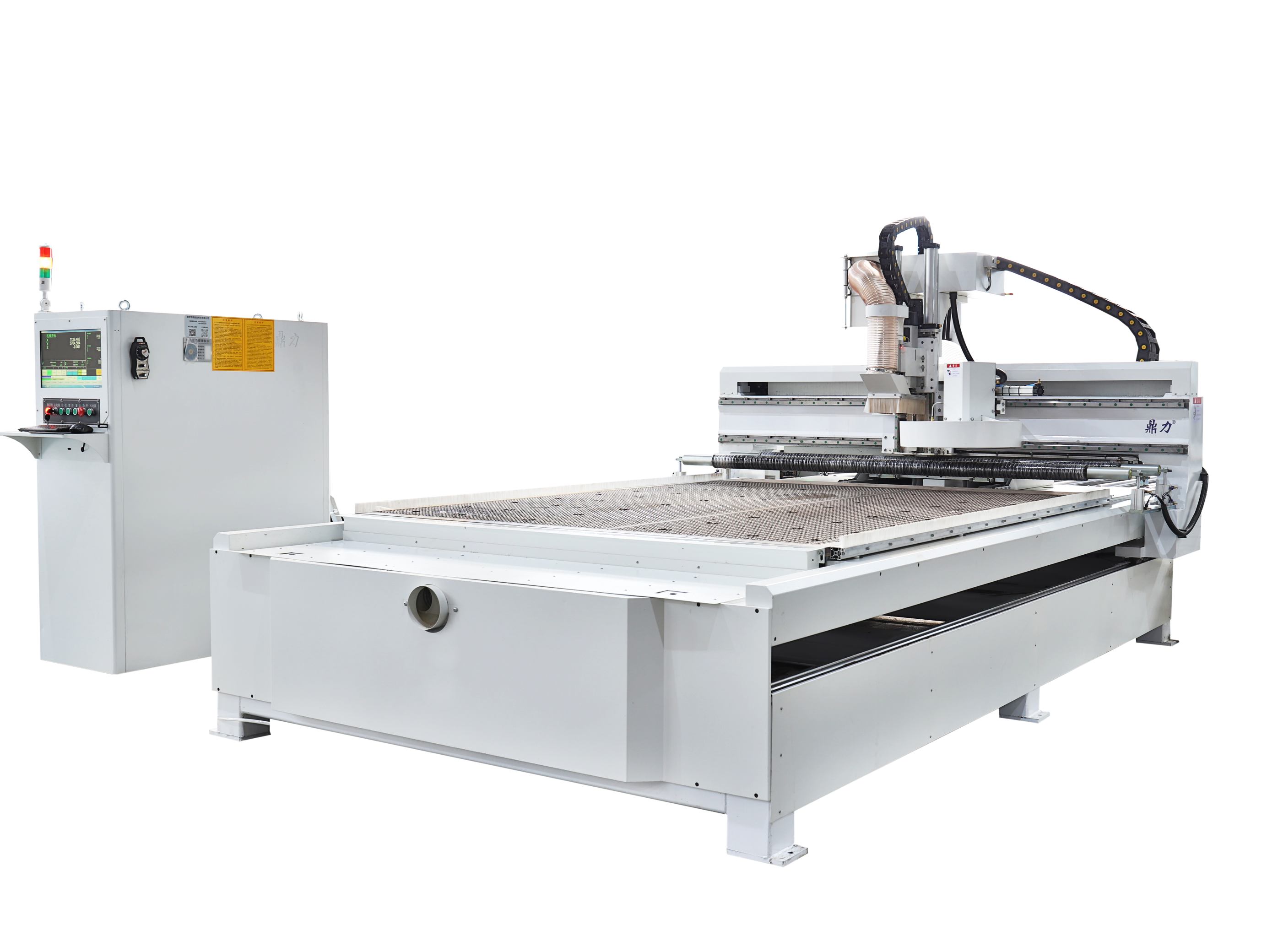 Machine table has double layout structure, the layout on the top is used for vacuum suction. It has air storage chanber. It can create a low-pressure gas chamber by emptying the air inside the storage chamber through the vacuum, and then press the board firmly on the table top by atmospheric pressure.
